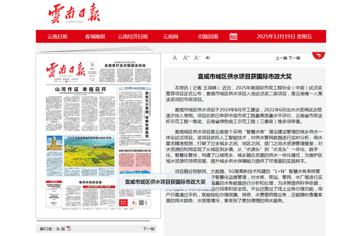 - 《云南日報(bào)》頭版:宣威市城區(qū)供水項(xiàng)目獲國際市政大獎(jiǎng)